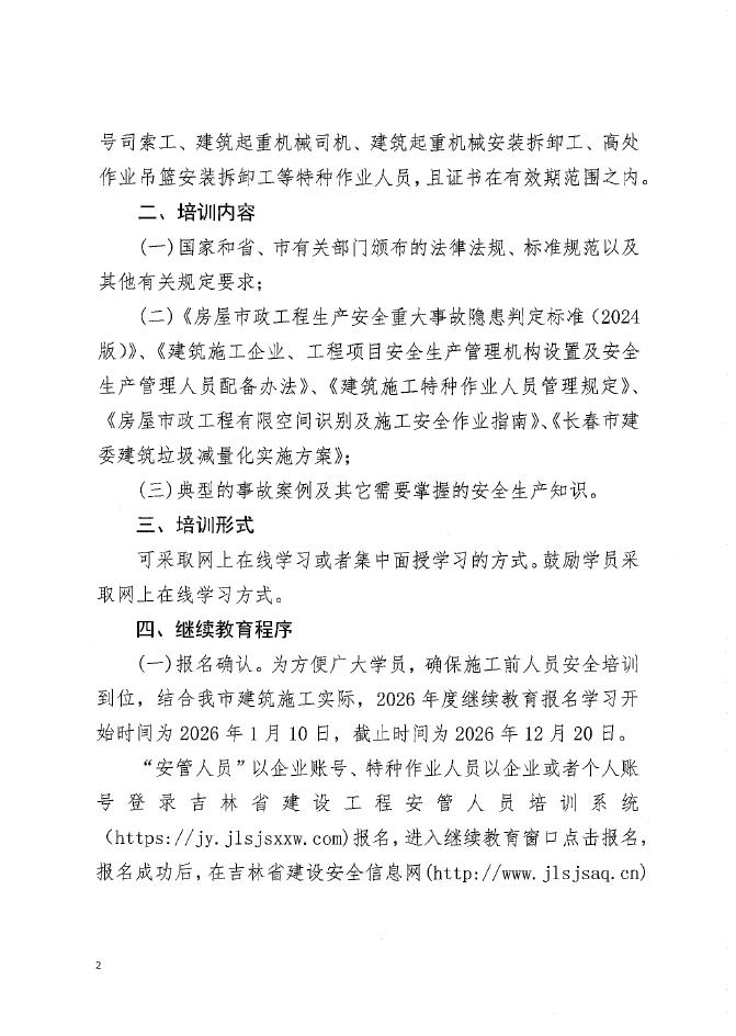 | 关于开展长春市2026年度建设系统安管人员及特种作业人员安全生产继续教育培训的通知 |